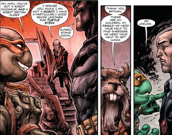 Im dritten Teil des Crossovercomics hat Krang die Realitäten von Batman und den Turtles so verändert, dass Alfred Pennyworth nach dem Tod des Ehepaars Wayne und dem vermeintlichen Verschwinden ihres Sohnes Bruce allein in Wayne Manor verweilte, bis es zur Ruine verkam. Als Bruce die Ruine von Wayne Manor besucht und den von Trauer und Verwahrlosung gezeichneten Alfred erblickt, erweckt dies bei beiden ihre wahren Erinnerungen.[8] Danach steht Alfred Bruce Wayne/Batman und den Turtles zur Seite, um die von Krang verursachten Veränderungen der Realitäten rückgängig zu machen.[9]