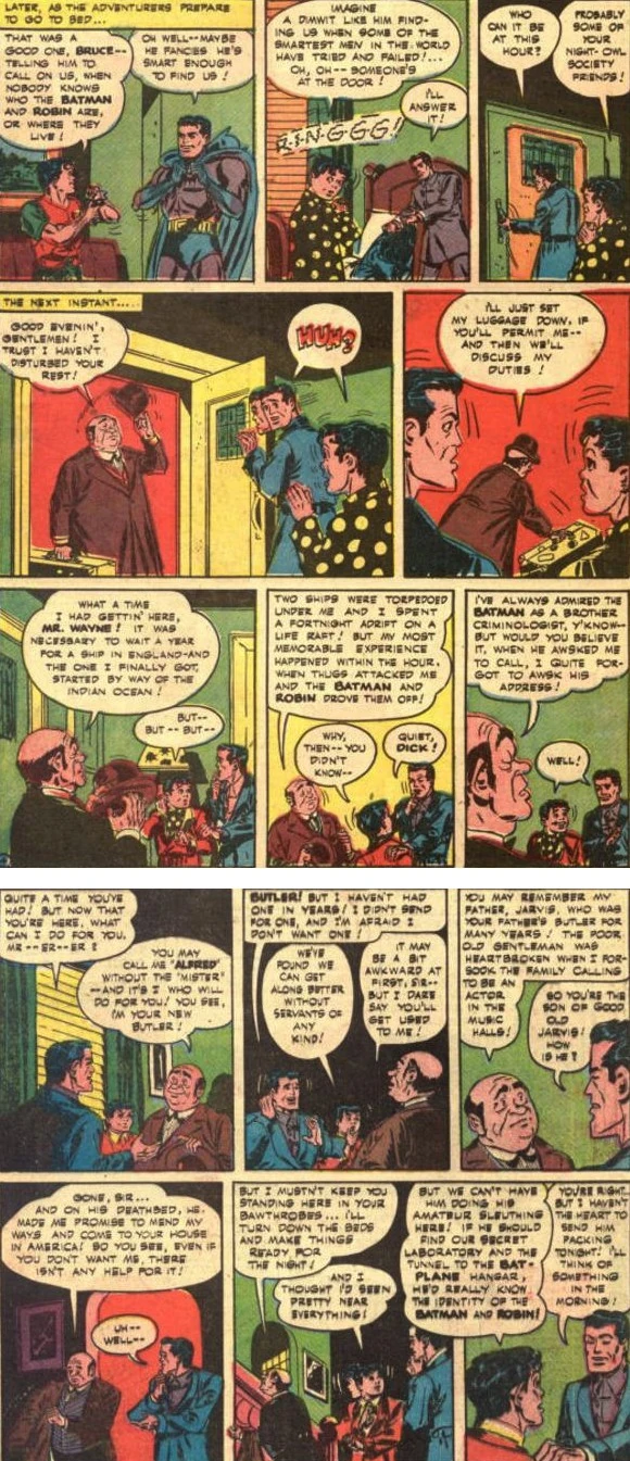 Die Originalgeschichte von Alfred etablierte ihn als einen ehemaligen britischen Geheimagenten, Amateurdetektiv und Schauspieler, der nach dem Tod seines Vaters Jarvis dessen letzten Wunsch folgte und überraschend bei Bruce Wayne und dessen Mündel Dick Grayson einzog, um ihnen als Butler zu dienen.[1]