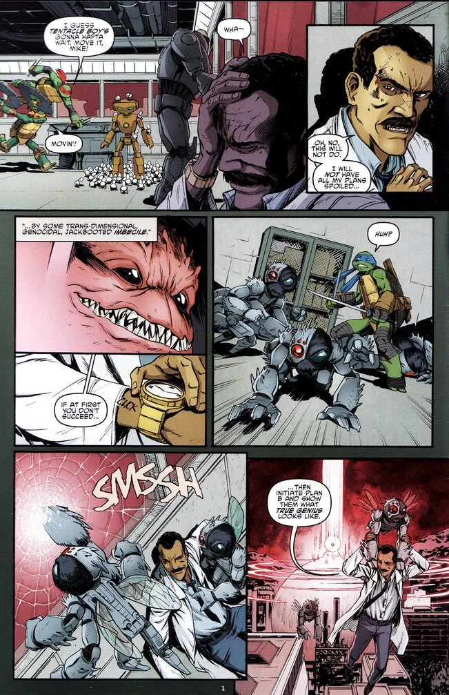 Während der Technodrom mit seinem Zerstörungswerk beginnt, schwelgt Krang im selbstsicheren Triumph über seinen Sieg über die sinnlose Zerstörung, die sein Vater über ihre Heimatwelt gebracht hat[1], und achtet dabei kaum auf das, was sich um ihn herum ereignet. So können sich die Turtles nach und nach von StockmansFlyborgs freikämpfen und dem Fugitoden zu Hilfe eilen, der von Stockmans Mini-Mousern in Schach gehalten wird. Stockman aber kommt währenddessen wieder zu sich, und als er sieht, dass seine Chancen bei Krang auf den Nullpunkt gesunken sind, ruft er seine beiden noch verbliebenen Flyborgs zu sich und entkommt mit ihrem Beistand aus der Kommandozentrale des Stützpunkts.