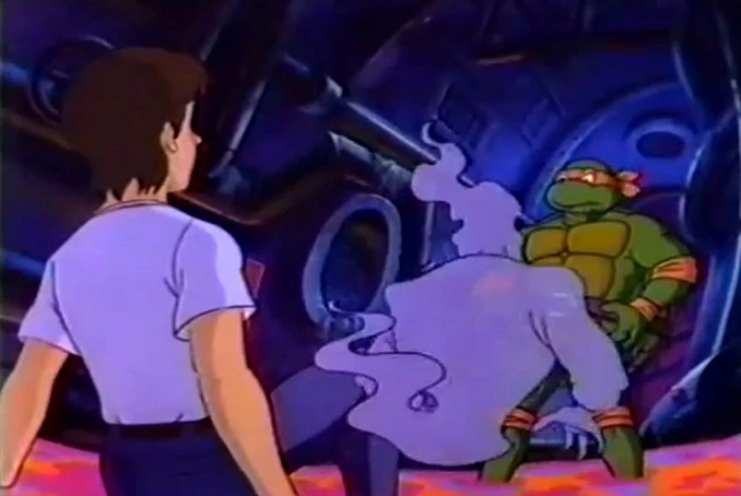 Michelangelo: Cowabunga, Kleiner! Wie bist du nur so unwahrscheinlich cool geworden? Michael: Was mache ich denn hier unten?! Michelangelo: Du bist in ein ziemlich radikales Loch gefallen, Kleiner. Du hättest es vermeiden können, aber du hast nicht nachgedacht! Wenn man's recht bedenkt, ist das der größte Teil deines Problems! Michael: Welches Problems!? Michelangelo: Drogen, Mann! Dein Gehirn muss ja schon ganz schön durcheinander sein! "Smoke": Drogen tun dem Gehirn gar nichts. Sie lassen ihn nur glücklich fühlen, stimmt's, Mikey? Michael: Genau! Michelangelo: Ha, Kleiner! Wenn du diesem Kerl glaubst, dann steckst du wirklich in Schwierigkeiten! Überzeug dich besser selbst!