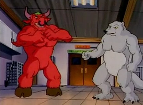 Shredder hatte eines Tages die Absicht, neue Mutanten als Helfershelfer zu erschaffen und platzierte dafür einen Gorilla und einen Löwen aus dem New Yorker Zoo unter einem Mutagentank. Doch die außerirdische anthropomorphe Schildkröte Kerma vom Volk der Turtleoids vom Planeten Shell-Ri-La befreite diese Tiere, und an deren Stelle tauchten ein Stier und ein Maulwurf auf. Der Stier stieß mit seinen Hörnern den Tank an, und das Mutagen wurde über sie gegossen. Das hatte zur Folge, dass der Stier und der Maulwurf anthropomorphe Formen annahmen.[1]