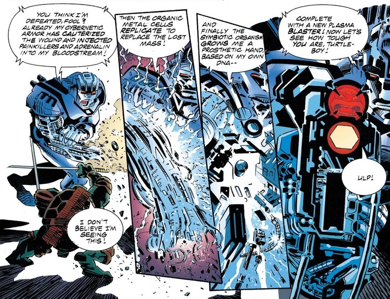 - Der zweite Cyborg fiel zusammen mit Donatello aus dem Hubschrauber, in welchem sie und Splinter zu Komodos Anwesen transportiert wurden.[2] Donatello überlebte den Sturz mit zerbrochenem Rückgrat und wurde von den Systemen des Cyborgs, die gerade noch funktionierten, selbst in einen Cyborg verwandelt.[3] Die künstliche Intelligenz, die die Naniten der kybernetischen Hüllen steuerte, versuchte später die Kontrolle über Donatellos Körper zu übernehmen; doch nachdem es dem Turtle gelang, diese abzuschütteln, versuchte die KI sich daraufhin an den plasmischen Androiden Lurch anzuheften.[4]