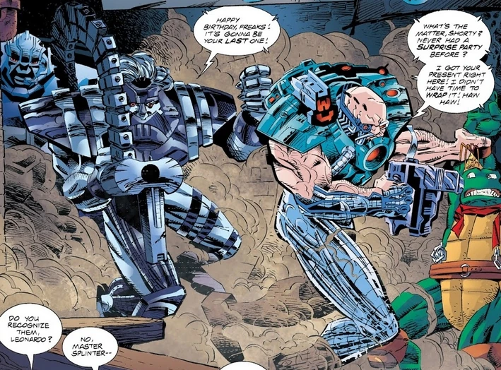 - Einer der Cyborgs wurde von Leonardo zerstört, nachdem Raphaels Gesicht von dessen Plasmablaster halb verbrannt wurde.[2]
