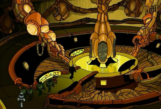 In der Kammer im T.C.R.I., in der die Turtles unlängst und so plötzlich von der Erde nach D'Hoonib verschlagen wurden, arbeiten Mortu und einige Alien-Techniker fieberhaft an der Reaktivierung ihres Teleporters. Schließlich aktivieren sie das Gerät, und die Turtles - und ihr Freund, Professor Honeycutt - materialisieren sich auf der Plattform.