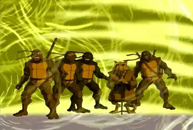 Die Turtles: MEISTER SPLINTER!! [Die Vier umarmen Splinter] Splinter: [angestrengt] Meine Söhne, es ist schön, auch euch wiederzusehen. - Bitte! Mein Rückrat!
