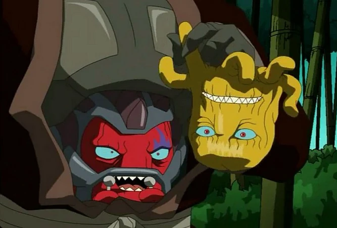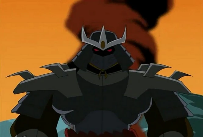 [Der Shredder erscheint, sehr zum Entsetzen der Turtles] Michelangelo: Seht ihr auch, was ich sehe?! Leonardo: Er sieht irgendwie wie der Shredder aus! Raphael: Etwas zu sehr wie der Shredder! Donatello: Aber das kann nicht sein! [...] Das kann nicht unser Shredder sein! Das hier ist über siebenhundert Jahre her! Das muss der Vorfahre des Shredder oder so sein!