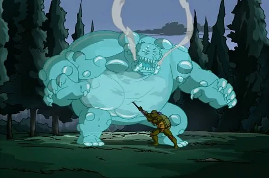 - In den TMNT-Medien wird das Monster mit keinem Eigennamen versehen. Der hier benutzte Name stellt sich aus den markantesten physischen Merkmalen zusammen, welches dieser Charakter bei seinen Auftritten aufweist.