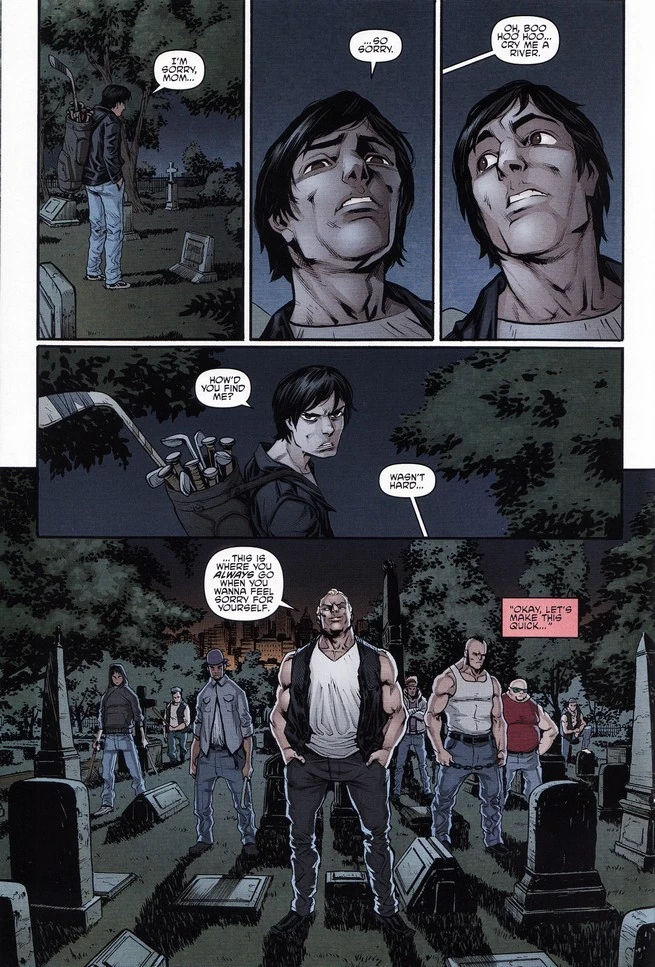 In der Zwischenzeit ist Casey in seiner Depression über den Verlust seines Vaters und seines Hockeystipendiums, bedingt durch die ihm vom Shredder zugefügten Verletzungen,[6] auf den Friedhof gegangen, auf dem seine Mutter ruht. Jedoch wird sein Moment der Sehnsucht und Reue von niemand anderem als Hun und den Purple Dragons rüde unterbrochen, da Hun wusste, dass Casey in seinen depressiven Momenten gerne hierher begibt. Nun will Hun seine Obligation zum Shredder erfüllen und Casey eliminieren, nachdem dieser sich geweigert hat, dem Foot Clan beizutreten.[1]