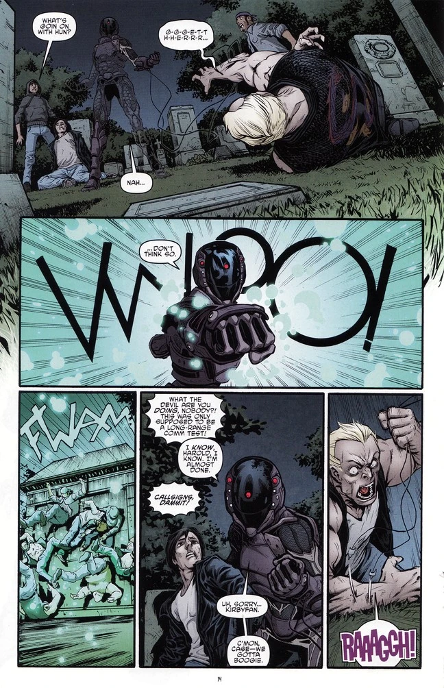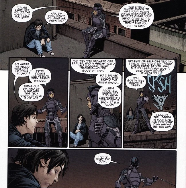 Später, auf einem Dach, erklärt Angel, dass sie sich nach Caseys deprimierten Rückzug[1] gedacht hatte, dass er das Grab seiner Mutter aufsuchen und dabei in Schwierigkeiten geraten würde, und nachdem sie Harold dazu überreden konnte, sie den Kampfanzug anziehen zu lassen - für einen Kommunikatortest, wie sie ihm weisgemacht hatte -, hatte sie ihn dann am Friedhof abgepasst. Sie gibt ihm den Ratschlag, sich nicht mehr zu sehr an die Vergangenheit - besonders nicht an seinen Verlierer von einem Vater - zu hängen, sondern sich stattdessen einen eigenen Weg zu suchen und es für sich selbst besser zu machen.