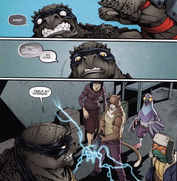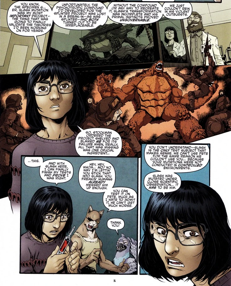 Slash jedoch nimmt den beiden die Entscheidung ab. Er hat genug vom Gespräch mitbekommen, um zu wissen, welche Chancen das Serum ihm geben könnte, und so schnappt er sich spontan die Spritze und injiziert sich das Mittel selbst. Doch kaum ist das Seum in seine Blutbahn gelangt, wird er plötzlich wild vor Schmerzen und attackiert Michelangelo, als dieser ihm zu Hilfe kommen will. Bevor er diesem und Raphael aber noch den Garaus machen kann und Hob sich gezwungen sieht, ihn mit einem Taser ruhigzustellen, zeigt das Serum seine Wirkung: Slash verliert seine Aggression, sein Verstand wird klarer, und er versichert den anderen in perfekt artikulierten Sätzen, dass jetzt wirklich alles in Ordnung mit ihm ist!