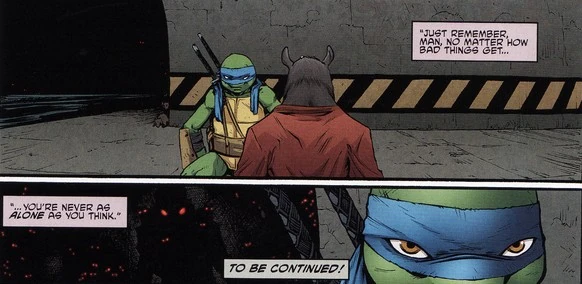 Zur gleichen Zeit sitzen Leonardo und Splinter immer noch ihn ihrer Meditationsrunde im Versteck vertieft, dabei nicht merkend, dass sie aus dem Schatten des nahen Abflusstunnels heraus von Dutzenden kleiner roter Augenpaare - und einem größeren Paar - beobachtet werden...