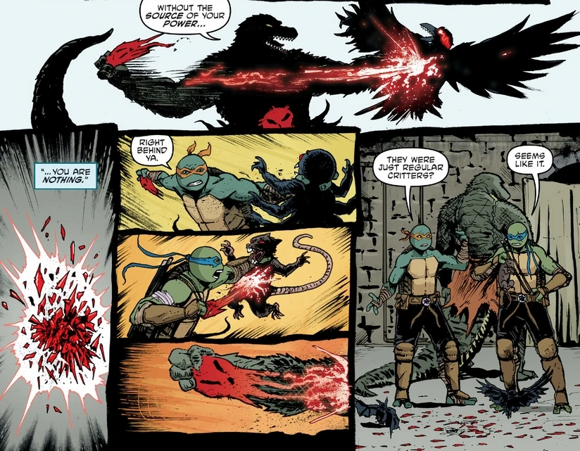 Mit der Zeit begann Barlow auch anderen Wesen - darunter Leatherhead, seinen bereits toten Handlangern Groundchuck und Dirtbag, und dem Wieselkind Mushroom - und auch sich selbst ebenfalls solche Bruchstücke zu implantieren.[2] Da Leatherheads Wille jedoch sehr stark war, musste Barlow sich der Night Terrors bedienen, um ihn unter Kontrolle halten zu können.[3] Schließlich aber konnten die Turtles und Leatherhead den Night Terrors ihre Schuppenfragmente entreißen und somit die Verwandlungen, denen sie untergangen waren, wieder rückgängig machen.[4]
