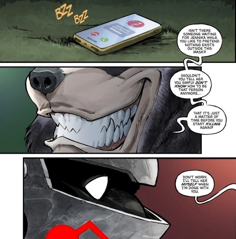 Während sie gegeneinander duellieren, stichelt Lao Ban seine Gegnerin fortwährend mit den in seiner Ansicht "schlechten" Entscheidungen, die sie zu einem Leben als Verbrechensbekämpferin - und damit auf die "falsche Seite" - geführt haben, während er sich gegen jeden Widerstand als Spitzenprädator behaupten kann. Jennika jedoch lässt sich weder in ihren Entschlüssen noch in ihrem Kampfeswillen beirren und leistet verbissenen Widerstand. Als inmitten des Duells Jennikas Telefon einen weiteren Anruf von Sheena erhält, sieht Lao Ban darin seine Chance, Jennika den emotionalen Todesstoß zu versetzen, indem er verspricht, Sheena von ihrem Doppelleben und dem Geheimnis, von dem sie sich selbst hinter einer Maske versteckt, zu erzählen, bevor er Jennika mit einem massiven Hieb, der ihr die linke Hüfte zertrümmert, in die Knie zwingt.