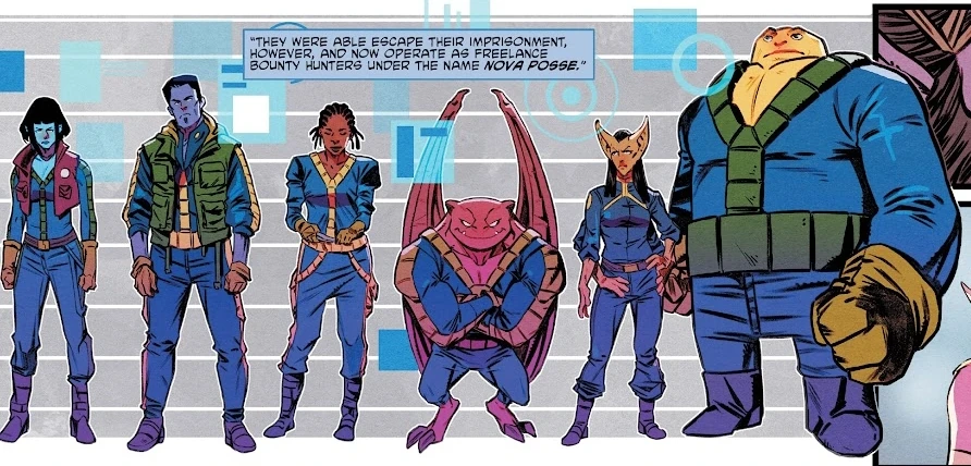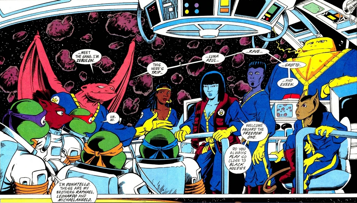 Das Nova Posse war Teil einer Flotte von Bewohnern aus der Dimension X, welche sich gegen das Schwarze Loch verbündet hatte, welches aus scheinbar unerklärlichen Gründen vor sechs Monaten ganz plötzlich entstanden war. Während die Aliens sich mit den Turtles besprechen wollten, wurde Donatello von den Söhnen der Stille entführt, welche mithilfe des Turnstones das Schwarze Loch erschaffen hatten, um die Dimension X zu verschlingen.[3] Hinzu kam, dass Mazool, der Diktator von Aerwyl, das Chaos, welches das Loch auslöste dazu nutzen wollte, um den Rest der Dimension X unter seine Herrschaft zu bringen. Die Nova Posse, einst als Nova Squadron Teil der Aerwylischen Sternenflotte, rebellierte gegen Mazools Ambitionen und machte sich daraufhin selbstständig.[4]