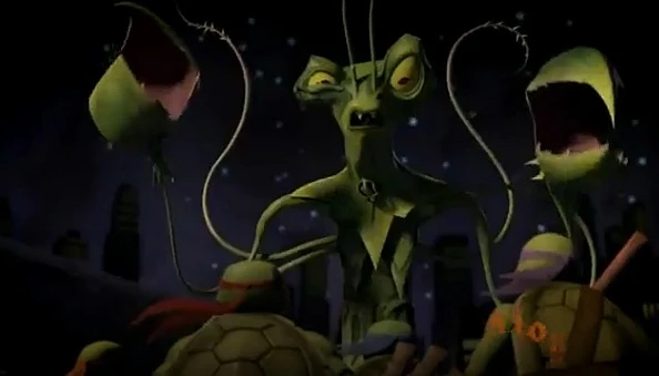 Doch bevor die Turtles das Schloss zur Zellentür knacken können, werden die beiden Gefangenen von den Kraang aus der Zelle geholt und nach draußen zum Hubschrauber gebracht. Zudem stellt sich ihnen auch noch Snake in den Weg, zu einer riesigen Chimäre aus Mensch und Pflanze mutiert, die Rache an den Turtles sucht. Leonardo, Michelangelo und Raphael stellen sich Snakeweed (sowie er von Mikey jetzt genannt wird) und den als Verstärkung herbeieilenden Kraang, während Donatello zum Hubschrauber geschickt wird, der gerade im Begriff ist, abzuheben. Im Laufe des Gefechts kommt Leonardo eine gute Idee: Er bringt Michelangelo und Raphael dazu, Snakeweed und die Kraang gegeneinander auszuspielen, und dabei stolpert Snakeweed gegen einen Generator, der im Hof steht. Die Blastertreffer der Kraang-Wachen führen dazu, dass der Generator einen Kurzschluss erleidet und explodiert, wobei Snakeweed allem Anschein nach mit zerstört wird.