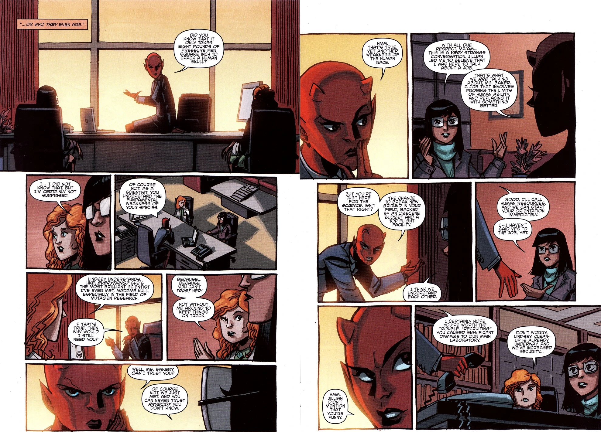 In der Zwischenzeit sitzen Lindsey und Jillian im Büro der Firmenvorsitzenden der Null Group, Madame Null, bei einem sehr seltsamen Vorstellungsgespräch. Madame Null, eine dämonisch aussehende Frau, die sich als ein weit höheres Lebewesen als einen Mensch bezeichnet, bietet Lindsey unter Jillians Fürsprache einen Job an, damit sie ihre Arbeit im Gebiet der Mutagenforschung[2] für die Ziele der Firma einsetzen soll. Obwohl sie damit Lindseys wunden Punkt getroffen hat, ist diese die ganze Sache noch zu unheimlich, um sofort Ja zu sagen; doch Madame Null und Jillian setzen sich über ihre Bedenken weg und nehmen den Kontakt mit der Personalabteilung auf.