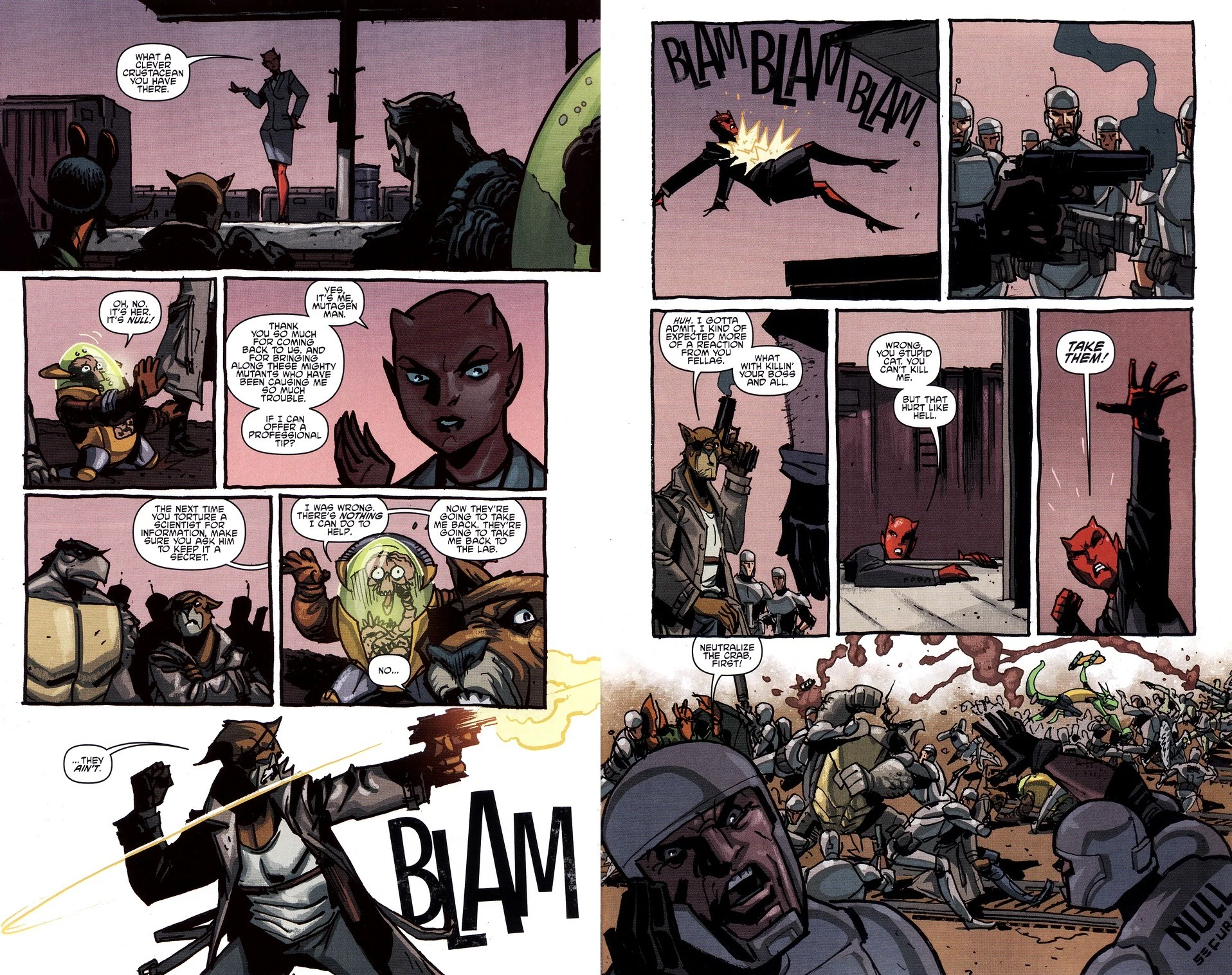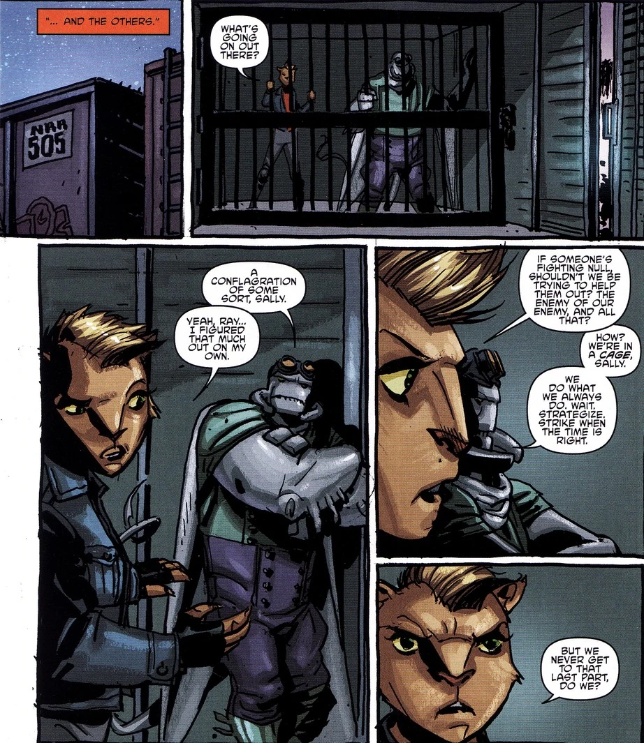 In einem nahen Güterwagen sitzen die beiden gesuchten Mutanten, eine Katzenfrau namens Sally und ein Rochenmann mit dem Namen Ray, und hören dem Kampflärm draußen zu, ohne zu wissen, was da vor sich geht und wie sie den Feinden von Null helfen könnten. Gleich darauf jedoch werden die besiegten und ohnmächtigen Mutanimals, die von den Null-Troopern gefangen wurden, zu ihnen in den Wagen verfrachtet, sehr zum Schrecken der beiden, als sie sehen, dass es sich bei ihren neuen Mitgefangenen um "Artgenossen" handelt.