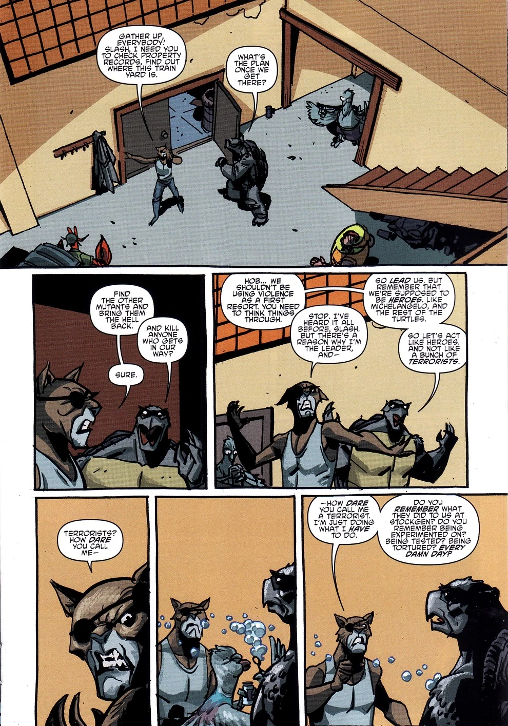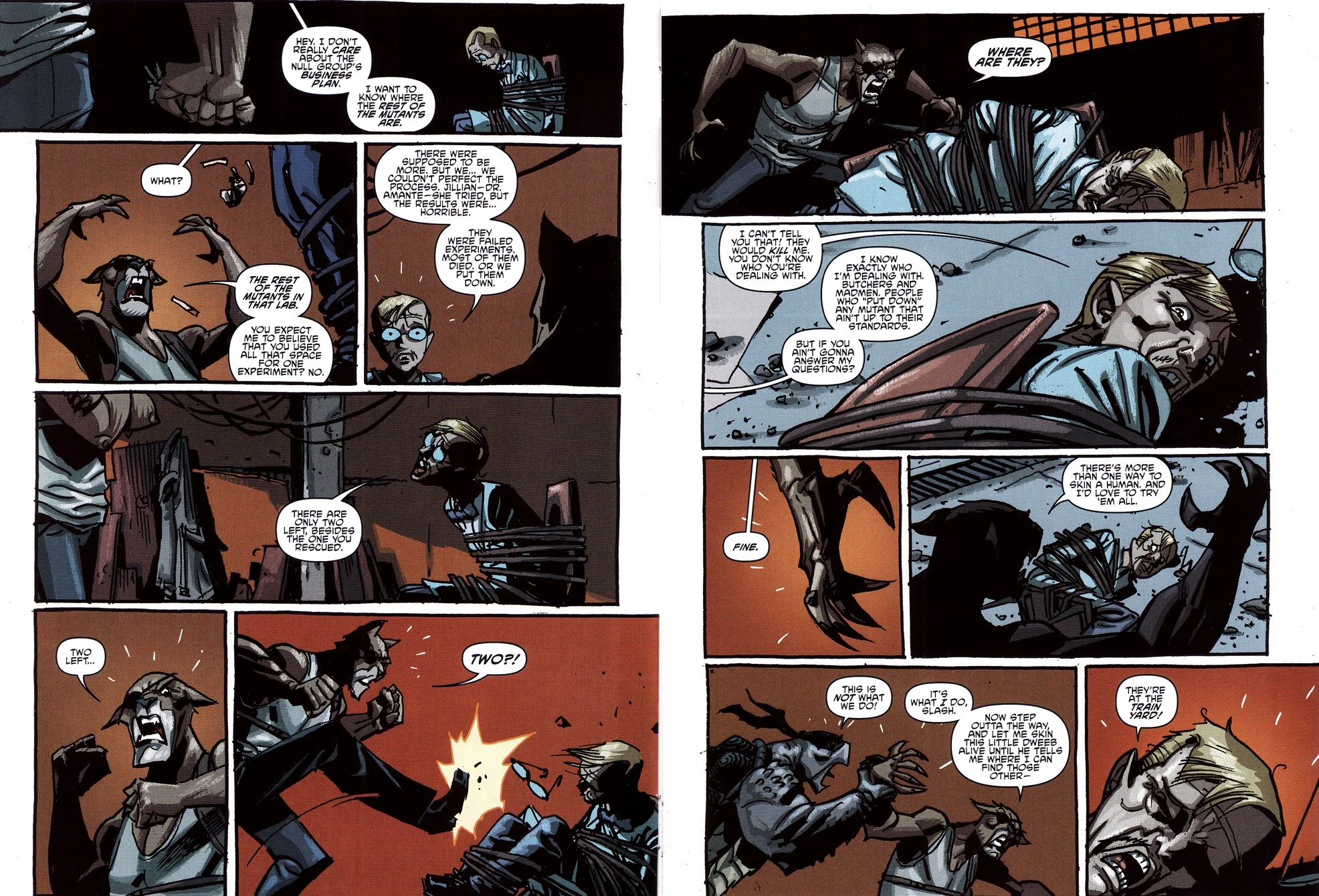 Wenig später sitzt der Wissenschaftler auf einem Stuhl gefesselt im Versteck der Mutanimals und wird von Hob und Slash ins Verhör genommen. Der Mann erzählt ihnen, dass die Null Group vorhat, Mutantenhybride (d.h. Mutanten, die mehrere natürlich getrennte Eigenschaften in sich vereinen) als Sklavenarbeiter zu erschaffen, mit ihnen die Vorherrschaft über die Weltwirtschaft an sich zu reißen und so zum Beherrscher der Welt zu werden. Doch die Experimente, die Jillian durchgeführt hat, sind größtenteils fehlgeschlagen; nur zwei weitere Mutanten hätten nebst Mutagen Man ihren Schöpfungsprozess überlebt. Aufgebracht verlangt Hob zu wissen, wo sich die beiden befinden, und bedroht den Mann sogar mit dem Tod, bevor dieser vor Angst ausruft, dass sie sich zur Zeit auf einem Güterbahnhof der Null Group im nördlichen New Jersey befinden, von welchem sie aus abtransportiert werden sollen.