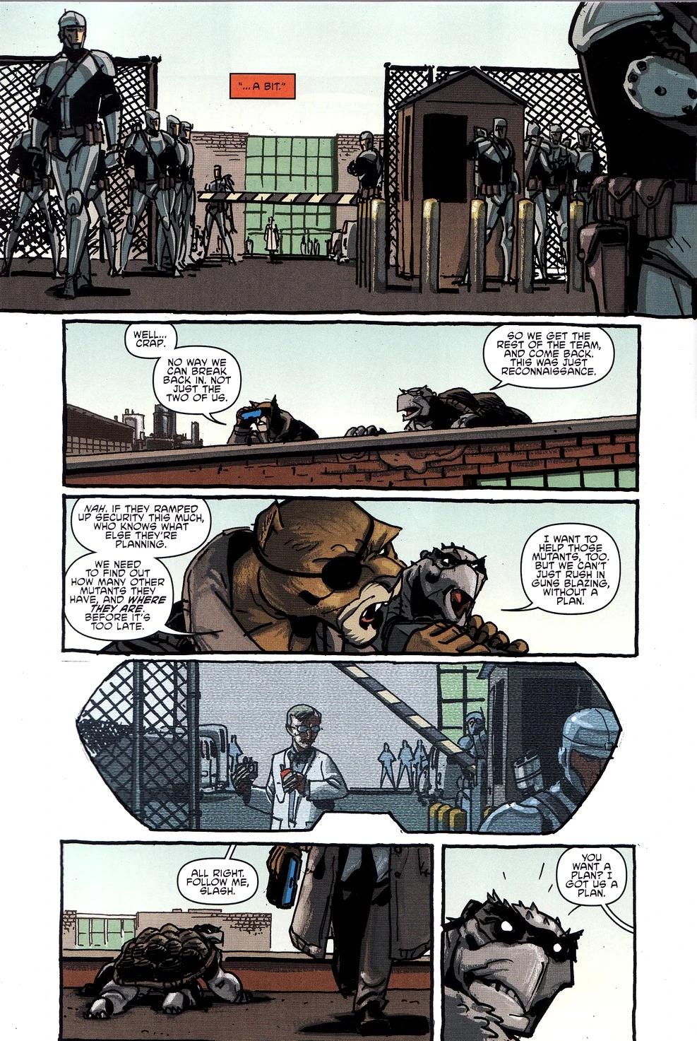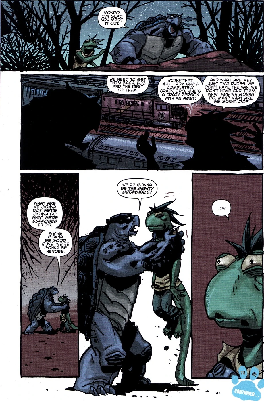 Währenddessen sammeln sich Slash und Mondo Gecko - die einzigen ihres Teams, die entkommen konnten - außerhalb des Bahnhofs und beobachten von einem sicheren Versteck aus die Vorgänge auf dem Gelände. Mondo beginnt daran zu verzweifeln, wie sie ihre Freunde jetzt da befreien sollen; Slash aber weigert sich die Hoffnung aufzugeben, und verkündet, dass sie das tun werden, was sie tun müssen, nämlich ihr Zeug als Helden zu beweisen... als die Mighty Mutanimals!