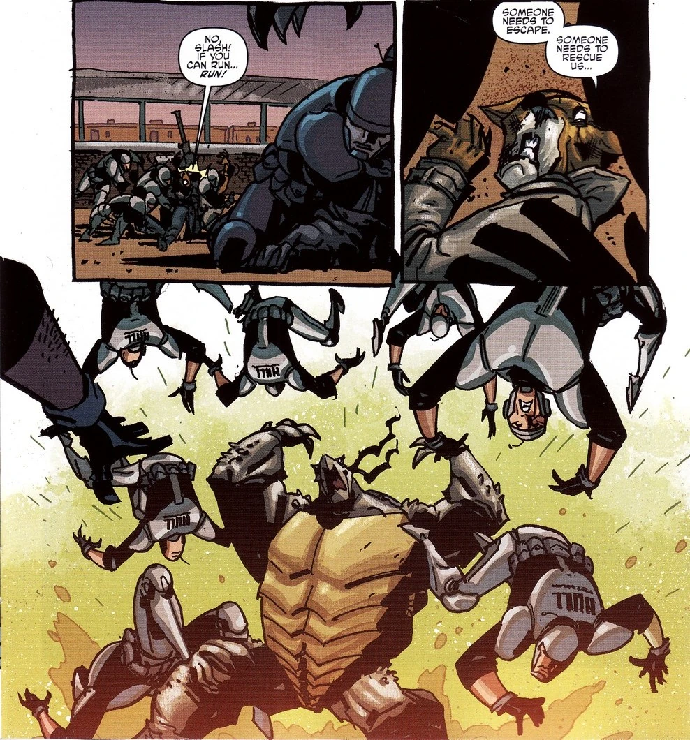 Als Dank für diese Informationen will Hob den hilflosen Mann erschießen, doch Slash kann dies noch verhindern. Als Hob zum Sammeln ruft, kommt es zu einer Meinungsverschiedenheit zwischen ihnen, weil Slash, von seiner Freundschaft mit Michelangelo inspiriert,[3] sich lieber als Held als ein Terrorist etablieren möchte und daher das sinnlose Töten von Menschen ablehnt. Hob aber will sich nicht ins Handwerk reden lassen und befiehlt den Mutanimals auszurücken; und obwohl Hob ihn nach seinem Martyrium nicht damit belasten will und er selbst immer noch Angst hat, schließt sich auch Mutangen Man, der sich jetzt auch privat "Seymour Gutz" nennt, der Rettungsmission an.