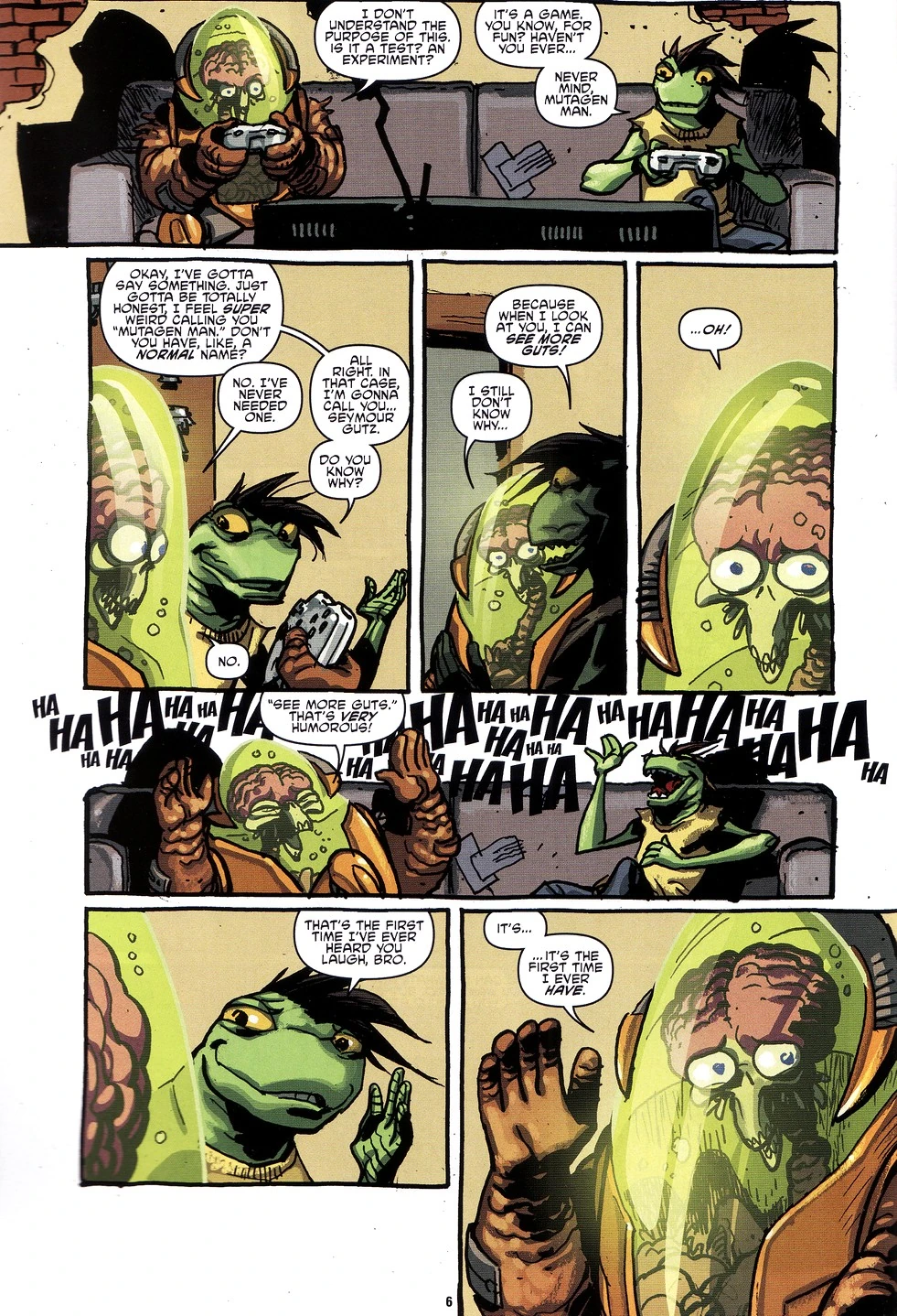 Am nächsten Morgen im Hauptquartier der Mutanimals gesellt sich Herman zu Mondo Gecko in die Küche, und die beiden unterhalten sich über ihre persönliche Eigenarten (Hermans militärisches Gehabe und Mondos Leichtigkeit des Seins), wie sie das Leben sehen und was sie letzte Nacht erlebt haben, besonders in Bezug auf ihren neuesten Freund, Mutagen Man.[1] Später, als Mutagen Man und Pete sich zu ihnen gesellen, lädt Mondo ihren Gast, der sich selbst ein wenig verloren fühlt, zu einem Videospiel ein. Mit seiner heiteren Persönlichkeit gelingt es ihm schließlich, Mutagen Man zum ersten Mal zum Lachen zu bringen, als er ihm einen neuen Spitznamen vorschlägt: "Seymour Gutz".