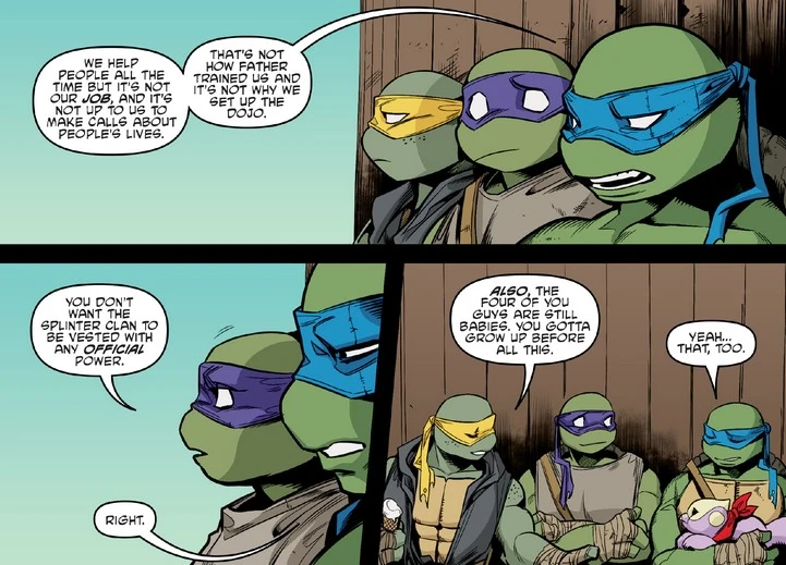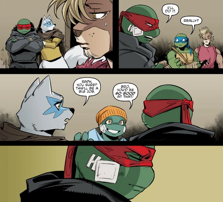 Während aber die Freunde dies alles besprechen, schleichen sich Zanna, Zink und Mushroom wieder einmal zu Hob, der bereits einen Plan gefasst hat, ihr Zutrauen zu ihm auszunutzen. Als die Freunde später eine Verteilung der Vorräte organisieren, sprechen Donatello und Jennika Leonardo an, nachdem dessen grüblerische Laune sie lange genug beobachtet haben. Auf ihr Zureden bekennt der Turtle, dass er den Posten als Ordnungshüter abgelehnt hat, weil er zwar den Unschuldigen weiterhin helfen will, aber seine Familie noch nicht - und möglicherweise überhaupt nicht - dazu geeignet sieht, eine Autoritätsposition über das Leben anderer Leute einzunehmen. Nur traut sich keiner von den Dreien, Raphael, der gerade grimmig neben Sally steht, diese Ansicht zu unterbreiten.