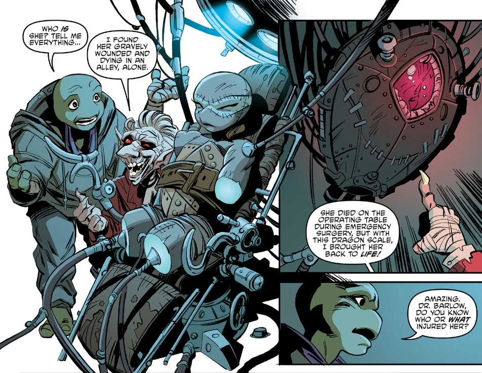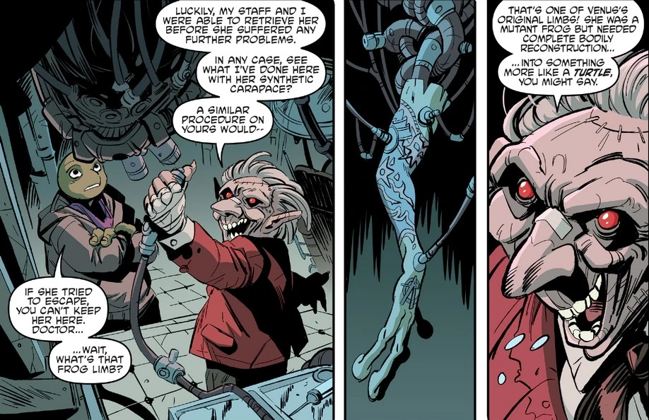 Währenddessen erklärt Barlow dem bestürzten Donatello, dass er sein neuestes Subjekt - Venus - schwer verletzt in einer Gasse gefunden hat; sie starb während der Operation, doch mithilfe einer Schuppe Des Drachens[1] konnte er sie wieder zum Leben erwecken. Jetzt erwartet sie die Transplantation ihrer neuen Gliedmaßen, während die Magie der Schuppe weiterhin ihre Verletzungen regeneriert; jedoch ist sie noch nicht in der Lage zu sprechen. dann aber zeigt Barlow seinem Besucher ein abgetrennte Bein, welches eindeutig von einem menschengroßen Frosch stammt, und er erklärt dem Turtle bereitwillig, dass Venus ursprünglich ein Froschmutant war und er sich nach ihrem Tod dazu entschlossen hat, sie in eine Schildkröte umzuwandeln und sie als Studienobjekt für weitere Experimente zu behalten.
