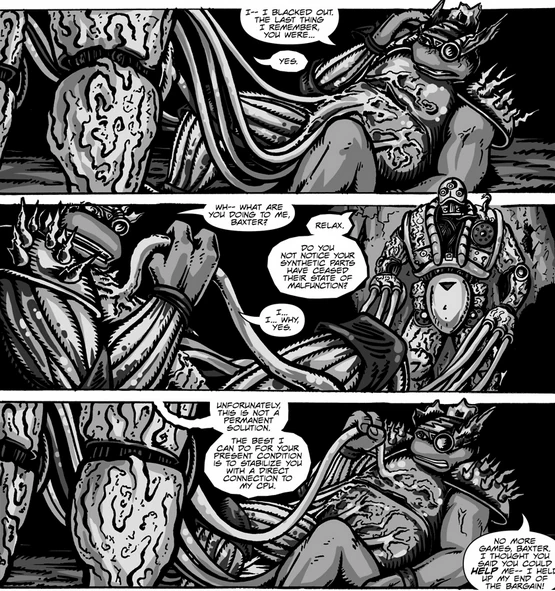 Donatello erwacht allmählich aus seiner Ohnmacht, um zu entdecken, dass Stockman sich physisch mit seinem Cyborgköper vernetzt hat.[1] Stockman hat dem Turtle noch einige Neuigkeiten beizubringen: Donatellos natürliche Heilungskapazitäten, und die Präsenz des Mutagens in seinem Körper, haben ihm einen Heilfaktor beschert, welcher - zusammen mit den Naniten seiner Cyborgsysteme - den zertrümmerten Panzer des Turtles im Laufe des letzten Jahres repariert hat.[2] Allerdings führt dieser Heilfaktor zugleich auch dazu, dass sein Körper die kybernetischen Teile abzustoßen beginnt, was sich letztendlich als tödlich für den Turtle erweisen wird. Stockman hat seine Kontrollsysteme mit Donatellos Körper verbunden und die Kontrolle über die Cyborgsysteme übernommen; und jetzt bereitet er sich darauf vor, seine Abmachung mit Donatello zum Ende zu bringen...