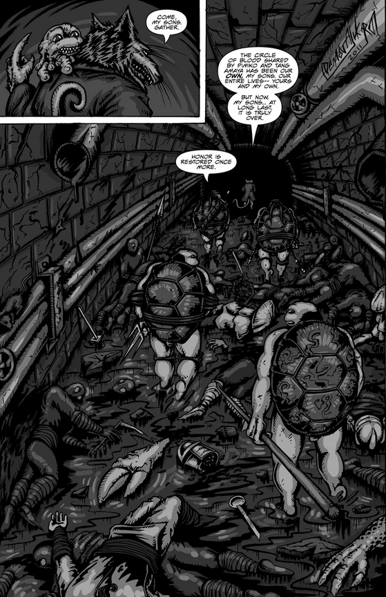 Die Foot Ninja steigen in die Kanäle hinunter, wo sie von den Turtles und Pimiko empfangen und niedergemacht werden, bis die Übermacht sie zu einem taktischen Rückzug zwingt. An einer anderen Stelle setzen die Fünf den Kampf fort, als sich die Foot-Leute auf einmal zurückziehen. Dann bricht die Decke ein, und zwei schreckliche Kontrahenten zeigen sich, von denen die Turtles geglaubt hatten, sie nie wieder sehen zu müssen: Der Winz-Shredder und der Klauen-Shredder, zwei Mitglieder des bizarren Shredder-Klontrios![7] Als wäre das nicht genug, taucht auf einmal King Komodo aus dem Kanalwasser auf und mischt sich ins Gefecht. Zuerst tötet der Mutant den Klauen-Shredder, ehe er sich Leonardo zuwendet, um ihm seine Niederlage bei ihrem letzten Zusammenstoß zu vergelten.[8]