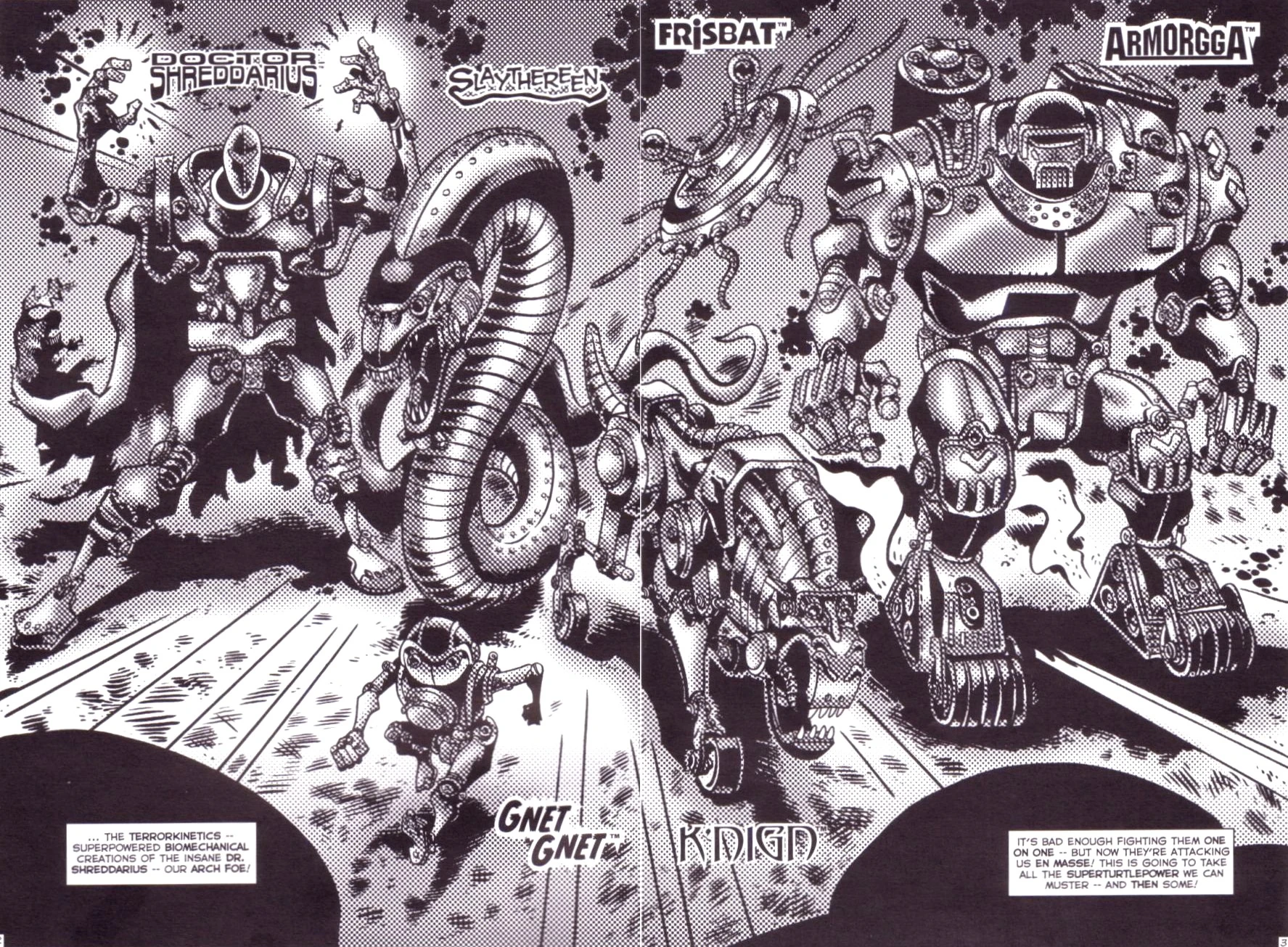 In einer alternativen Realität erwarb ein Mann namens Lucks während einer scheinbaren Invasion von Außerirdischen das Recht, die Welt führen zu dürfen, als Ausgleich für den Schutz, den er der Menschheit bieten könne. Nachdem sich die Regierungen der Erde einverstanden erklärt hatten, erschuf Lucks mithilfe eines Wissenschaftlerteams eine Gruppe von bio-mechanischen Soldaten, die Terrorkinetics. Einer der Wissenschaftler und Freund von Lucks, ein gewisser Doctor Shreddarius, jedoch begann Lucks eines falschen Spiels zu verdächtigen und experimentierte daher mit der gezielten Mutation von vier Schildkröten als seine Bodyguards. Die Chemikalienmischung, die er benutzte, mutierten zwar die Schildkröten, doch war sie auch sehr instabil und explodierte. Die vier Schildkröten erhielten nicht nur eine humanoide Gestalt und Intelligenz, sondern auch Superkräfte; desgleichen wurde auch eine Ratte, die an Shreddarius' Wunden leckte, vom Chemikaliencocktail mutiert.