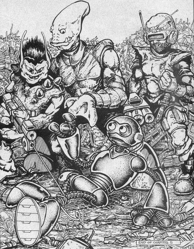 Honeycutt hat indessen keine Absichten, sich als Haushaltsroboter zu verdingen, zumal er damit Gefahr laufen würde, umso leichter von der Polizei entdeckt zu werden. So schmeißt er seinen "Besitzer", als dieser ihn in sein neues Zuhause fahren will, kopfüber in dessen eigenen Wagen und macht sich wieder einmal auf die Flucht. Doch wird er schnell von Föderationstruppen entdeckt und eilt aus einem überfüllten Marktplatz heraus in eine Seitengasse - die sich als Sackgasse entpuppt. Doch als die Soldaten sich den Fugitoiden gerade greifen wollen, blitzt ein gleißendes Licht auf, in dem sich vier Gestalten materialisieren - und von einem Augenblick zum anderen stehen die Teenage Mutant Ninja Turtles zwischen Honeycutt und seinen Verfolgern!