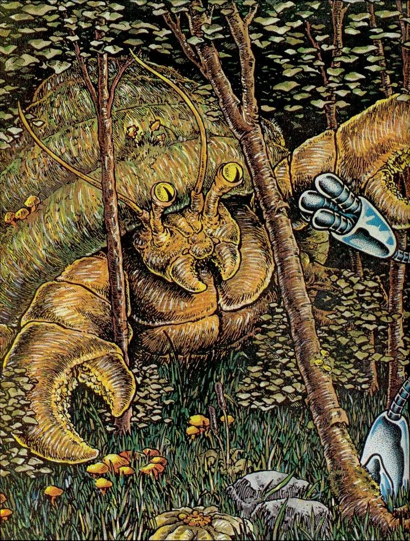 Indessen kommt Honeycutt auf eine Lichtung, in welcher eine Reihe von seltsamen, kegelförmigen Gebilden stehen, und in deren Deckung beschließt er sich für eine Weile auszuruhen. Doch dann hebt sich das Gebilde hinter ihm plötzlich an und enthüllt ein riesiges, einsiedlerkrebsartiges Wesen ...