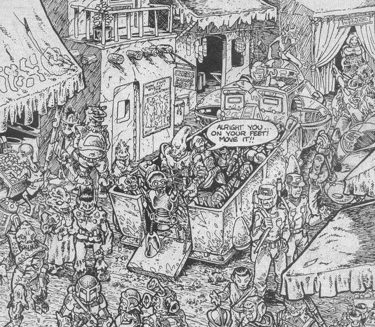Ohne weitere Schwierigkeiten ist Honeycutt nach Peblak gelangt und wandert nun in den schmalen Pfaden zwischen den meterhohen Schrottbergen in Richtung Innenstadt, ohne zu wissen, dass er dabei beobachtet wird. Erst als ein Fangkabel seine Beine einschnürt und er von zufrieden grinsenden, außerirdsichen Sklavenjägern umringt wird, merkt er, in was für einer Bedrouille er in diesem Moment steckt ...
