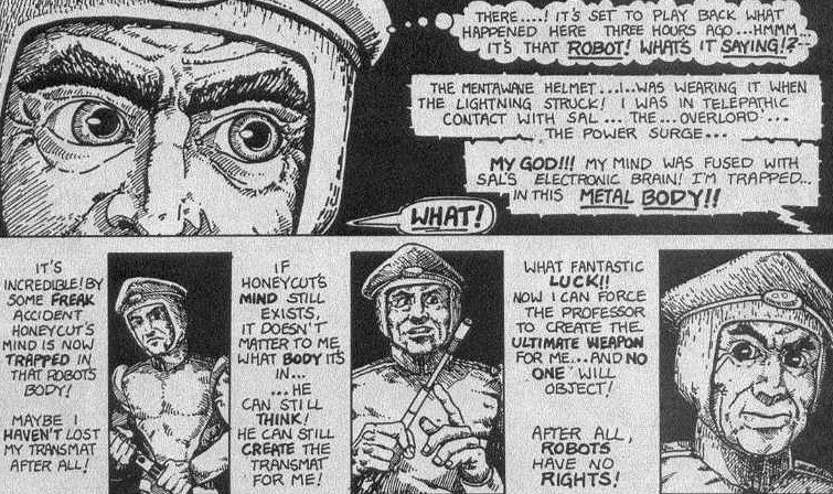 Und noch während Honeycutt über seine Verwirrung hinwegzukommen versucht, stellen sich draußen weitere Probleme ein: General Blanque trifft mit einer Eskorte vor dem Labor ein, um sich den Teleporter des Professors zu holen. Vor dem Labor aber finden die Soldaten den verkohlten menschlichen Körper des Professors vor; und als Honeycutt in SALs Hülle vor die Tür tritt, um einen Ort zu finden, wo er seine unerwartete Situation in Ruhe überdenken kann, vermutet Blanque in "SAL" den Mörder des Professors und befiehlt seinen Männern, das Feuer auf ihn zu eröffnen! Und angesichts dieser dramatischen Entwicklung und der Unglaublichkeit seiner Geschichte hat Honeycutt keine andere Wahl, als in den nahen Wald zu flüchten.