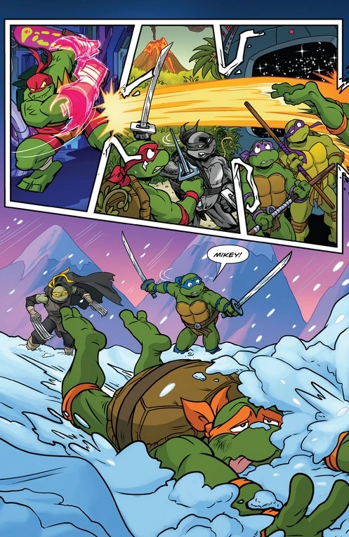 In der Cyberpunk-Stadt teilen die beiden Michelangelos sich eine Pizza. Doch als Michelangelo sich bereits sicher wähnt, erklärt sein Gegenstück hämisch, dass diese Aktion nur eine Finte gewesen ist, um ihn einzulullen und so leichter verlieren zu lassen. Zu spät fällt Michelangelo ein, dass es noch einen fünften Turtle im Spiel gibt - und zwar Raphaels Doppelgänger, der hinter Michelangelo auftaucht und mit einem Haken zu Boden fegt. Mit diesem Punkt an ihn teleportiert Ogg die beiden Turtle-Teams in die Arena zurück; doch als Leonardo ihn auffordert, die anderen Turtles nun freizulassen, entgegnet Ogg jedoch hohnlachend, dass diese anderen Turtles lediglich Geschöpfe aus ihren eigenen Traumvorstellungen seien. Und erst mit dem Stichwort "Traum" erkennen die Turtles - zu spät - dass sie nicht gegen andere Turtles, sondern gegen einen weiteren Feind angetreten sind, der mit ihnen ein altes Hühnchen zu rupfen hat: Creepy Eddie.[2]