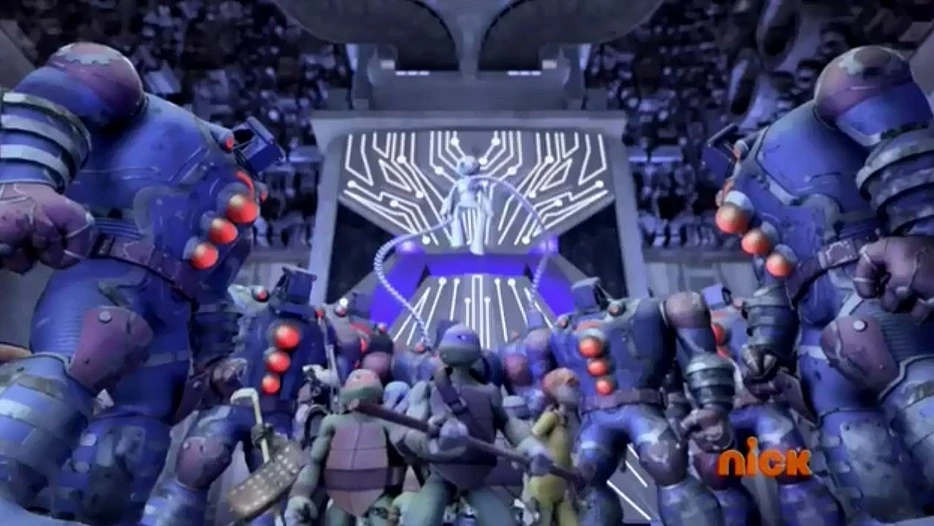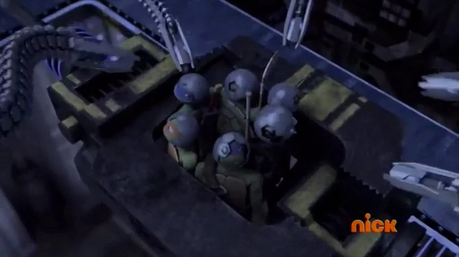 Die Turtles, April und Casey können nach und nach die sie angreifenden Roboter lahmlegen, doch gleich danach werden sie von massiven Greifzangen gefangengesetzt, und Overmind schickt sich an, sie in Roboter zu verwandeln, indem er ihre Körper in metallene Cyborghüllen einzuschließen beginnt. Doch im letzten Augenblick greift Armaggon (dem Lord Dregg den neuen Auftrag verpasst hat, die Turtles nun lebend zu fangen) ein und befreit sie aus dieser Falle. Dann aber werden sie per Hebeplattform vor den Hauptcomputerkern der Station, Overminds Wohnstatt, gebracht, wo Overmind nun auch den Rest der Roboter der Station auf sie loslässt.