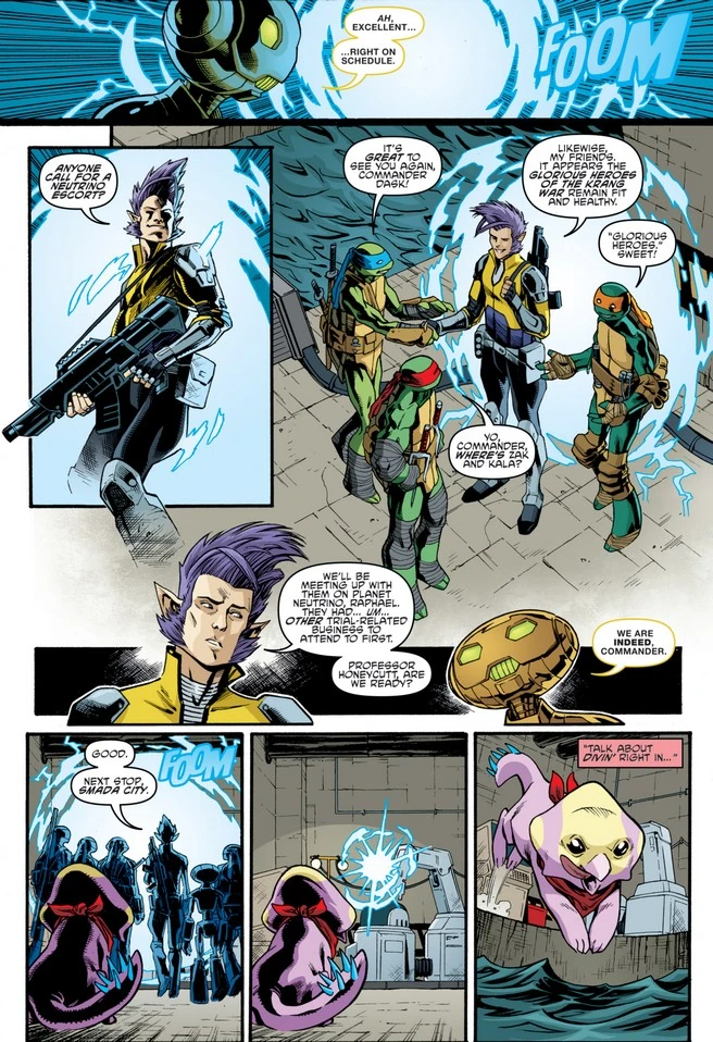 Die Turtles, Honeycutt und Dask treffen in einem Hangar in Smada City ein, wo die Turtles sich zu ihrem Schrecken ihrem alten Kontrahenten Leatherhead gegenüber sehen.[6] Dieser ist von Dask und dessen Teamgefährten Kala und Zak nach Neutrino geholt worden, weil er seinerseits als Zeuge gegen Krang aussagen möchte; aufgespürt hatten sie ihn in der New Yorker Kanalisation[7] mithilfe von Ma'riell und eines Peilsenders, den Krang dem Alligator während dessen Gefangenschaft[8] implantiert hatte (und den Leatherhead vor seinem Eintreffen in der Dimension X selbstständig entfernt hat, nachdem er von dessen Existenz erfahren hatte). Natürlich haben die Turtles wegen ihrer unliebsamen letzten Begegnung noch einige Vorbehalte gegenüber Leatherheads Verlässlichkeit, doch Dask kann seine irdischen Freunde mit einer besonderen Ankündigung ablenken, nämlich dass sie ein feierlicher Empfang erwartet für die Rolle, die sie bei der Befreiung von Neutrino von Krang gespielt haben.[2]