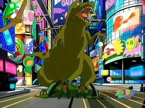 Raphael: Was zur Schölle war das Ding? Wo sind sie hin?! Michelangelo: Keine Ahnung. Nach was seh ich den aus?! [Plötzlich öffnet sich direkt hinter ihnen ein Portal, und ein hungriger Tyrannosaurus Rex stampft hindurch] Raphael: Äh ... nach Mittagessen?