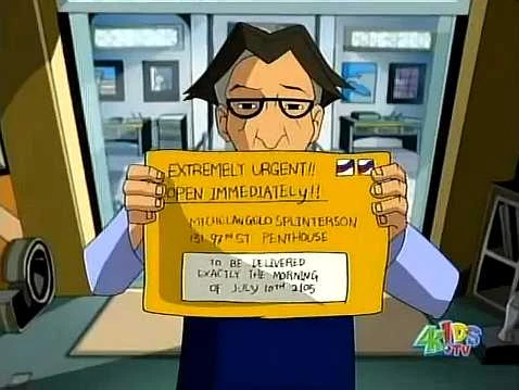 Triceraton-Postmeister: Spezialzustellung! Eine sehr spezielle Zustellung. Serling: [nachdem er einen Blick auf die Horde von Postboten geworfen hat, die vor der Tür steht] So scheint es. Nicht viel los bei der Post heute? Triceraton-Postmeister: Dieser Umschlag wurde bei uns seit über 100 Jahren aufbewahrt. Generationen von Postmeistern haben darauf aufgepasst, um sicher zu gehen, dass er genau an diesem Tag abgeliefert wird. Es ist zu einer Art Legende geworden! Äh, wir würden gerne wissen, was darin ist, und vielleicht könnten wir auch Mr. Splintersson sehen. [Serling macht die Tür vor ihrer Nase zu]
