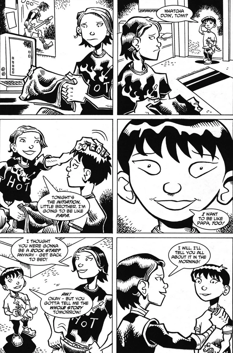 Tomi ist der Sohn eines japanischen New Yorkers, welcher insgeheim ein Mitglied des Foot Clans war. Neben diesem und seiner Mutter hatte Tomi noch einen kleinen Bruder namens Jiro, der ihn verehrte. Tomi hatte Pläne, ein Rockstar zu werden, und war ein talentierter Gitarrenspieler. Um nach dem Tod seines Vaters der Familie auszuhelfen, jobbte er in der Kaffeebar The Daily Buzz, welche von April O'Neil regelmäßig frequentiert wurde.[1]