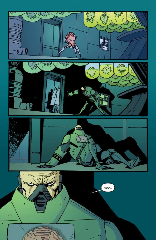 Durch Krangs Handeln[2] ist die Stromversorgung der Station wiederhergestellt worden, und somit steht Professor Honeycutt erneut zwischen zwei Entscheidungen. Entweder er nimmt sich das Leben, so wie er es von Anfang an geplant hat, um Krang den Zugriff auf sein Wissen für immer zu verwehren... oder er kontaktiert die Verbündeten, die er sich in seiner Zeit auf der Erde gemacht hat, und bittet sie um Hilfe. Er entscheidet sich für das Letztere und schickt von einer Computerkonsole eine Nachricht aus, ehe er von einem Steinsoldaten und einem Neutrino-Wissenschaftler erwischt wird und sich wieder in Gewahrsam nehmen lässt. Währenddessen kommt Krang wieder zu sich und wankt durch den Sturm zurück ins Stasis-Labor, wo er sich seine noch im Tiefschlaf befindlichen Leute betrachtet und ihnen ein einfaches Versprechen gibt: "Bald."