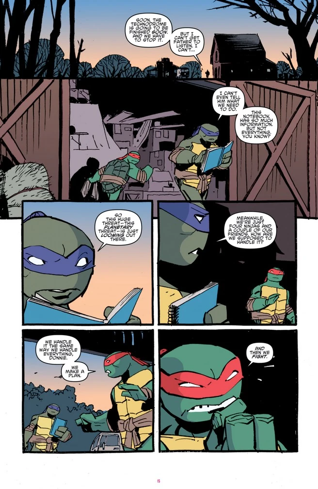 Szenenwechsel zur O'Neil-Farm nach Northampton, wo die Turtles sich nach Koyas Angriff für ihre Flucht fertigmachen.[3] Noch während sie ihre Siebensachen in Aprils Van laden, studiert Donatello immer noch Honeycutts Notizen und macht sich Sorgen darüber, wie sie die gigantische Maschine, die Krang sich auf Burnow Island baut, jemals außer Gefecht setzen sollen. Daraufhin antwortet Raphael mit seiner eigenen Sichtweise: "Wir erledigen es, wie wir es immer tun, Donnie. Wir machen einen Plan. Und dann kämpfen wir."