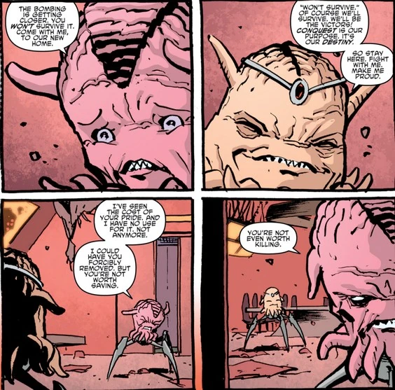 Bevor er sich zu ihnen begibt, sucht Krang noch einmal seinen Vater auf, der einsam in seiner Befehlszentrale sitzt und sich noch immer siegessicher gibt. Krang erklärt Quanin, dass er vor Jahren schon in Erwartung dieses Ereignisses heimlich ein Projekt in Auftrag gegeben hat, mit welchem die letzten ihres Volkes mittels einer neuen Stasistechnologie und dem noch verbliebenen Ooze am Leben erhalten werden können, bis Krang ihnen auf der Erde eine neue Heimat errichten kann. Er tat es heimlich, da er sich sicher war, dass sein Vater in seiner Vermessenheit alles versucht hätte, um dieses Projekt aufzuhalten. Krang versucht ein letztes Mal, Quanin zu überreden, sich ihm anzuschließen und zu überleben, doch Quanin hält weiterhin starrköpfig an seinen Größenphantasien fest, und Krang verlässt ihn voller Abscheu, kurz bevor die Rebellenflotte das Hauptquartier erreicht und unter Beschuss nimmt.