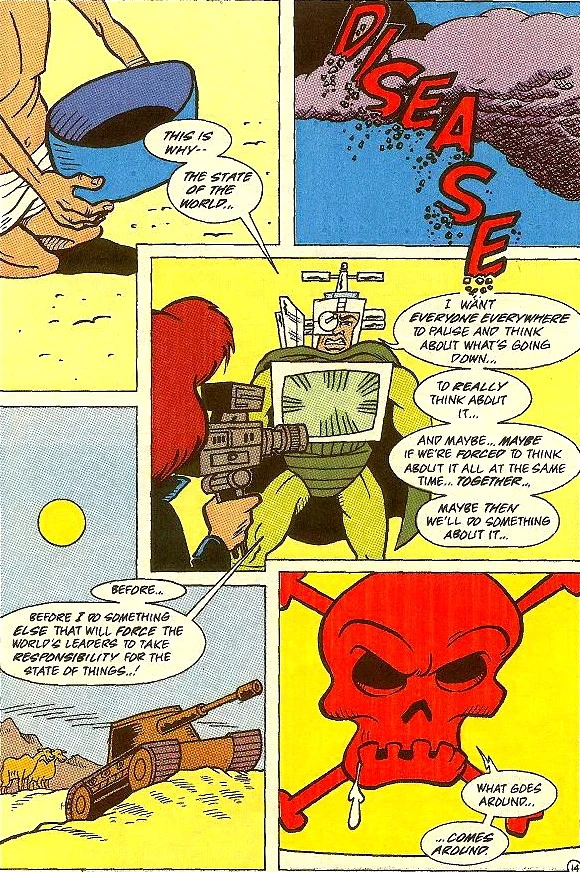 Eines Abends waren die schlechten Nachrichten, die er am Fernsehen mitverfolgte, schließlich zuviel für Vid, und in einem Wutanfall trug er den Fernseher vor die Tür, um ihn in den Mülleimer zu schmeißen. Jedoch genau in diesem Augenblick traf es sich, dass im Erdorbit ein Kanister mit radioaktivem Abfall, der im Weltraum "eingelagert" worden war, mit einem amerikanischen Satelliten kolliderte. Ineinander verkeilt fielen Satellit und Kanister gen Erdoberfläche - und direkt in Vids Mülltonne hinein. Die folgende Explosion verschmolz Mensch und Technik miteinander und kreierte einen bizarren Mischling aus Mutant und Cyborg.[1]