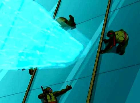 Mithilfe ihrer Hologrammkarte kann April den Turtles einen alternativen Eingang – eine Absaugöffnung – vermitteln, der mittels eines eigenen Hologramms als eins der Fassadenfenster getarnt ist. Kaum steckt Michelangelo aber seinen Kopf hinein, bildet sich vor ihm eine Ionenladung. Zwar kann er gerade noch den Kopf zurückziehen, doch das plötzliche Manöver bewirkt, dass er sich dabei von der Fassade des Gebäudes löst und im Fallen Donatello mit sich runter in die Tiefe reißt ...